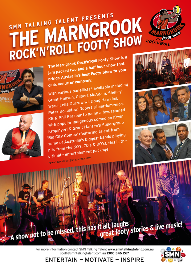 Exclusive to Talking Talent, The Marngrook ‘Rock n Roll’ Footy Show is a jam packed 2 1/2 hour show that brings Australia’s favourite footy show to your club, venue or company.